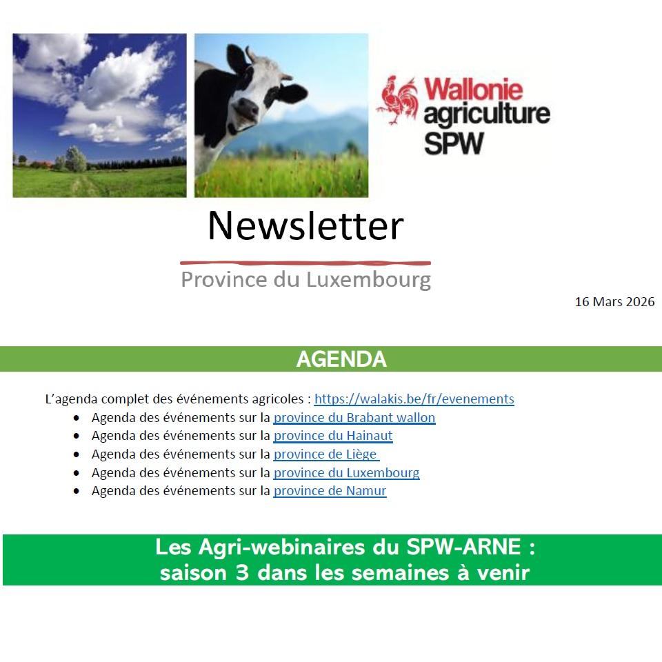 Le fichier : walakis.be/system/files/2026-03/260316-05NewsletterSPWARNELuxembourg.pdf L\'actualité Walakis : walakis.be/fr/actualites/agenda-du-spw-agriculture-en-province-de-luxembourg-du-16-mars-202
