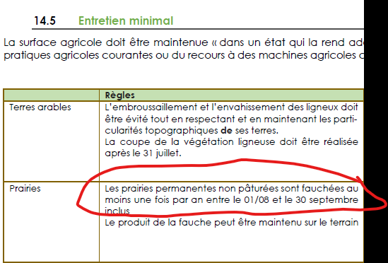 En parcourant le manuel d'aide au remplissage de la déclaration de superficie, je suis tombé sur l'entretien minimal à réaliser chaque année pour qu'une prairie soit admissible aux aides de la pac. Ils parlent d'une fauche obligatoire entre le 01 août et le 30 septembre?? Quelqu'un a déjà entendu ça? Donc si on fauche le 31 juillet et puis seulement le 5 octobre la coupe suivante, la prairie n'est pas admissible??