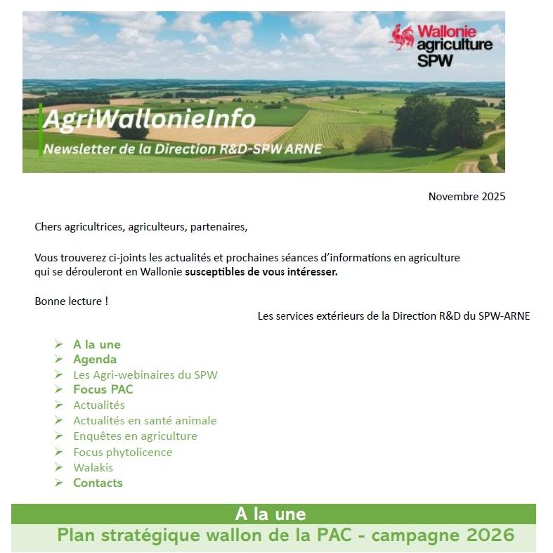 Découvrez AgriWallonieInfo de novembre, la newsletter de la Direction de la Recherche et du Développement du SPW-ARNE ! Le fichier pdf : walakis.be/fr/actualites/agriwallonieinfo-de-novembre-2025