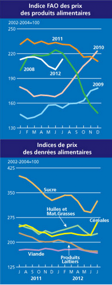 Reflétant la forte progression des cours des céréales et du sucre, l'indice FAO a bondit de 6% en juillet, s'établissant en moyenne à 213 points, soit 12 points de plus qu'en juin, mais toujours nettement en-deçà du pic de 238 points atteint en février 2011.